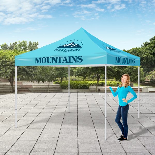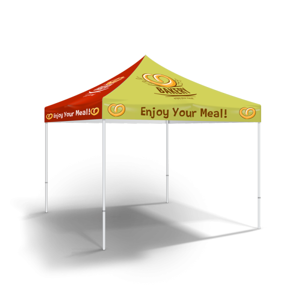 Event Tents are the perfect large-scale marketing medium to get noticed at festivals, conventions, trade shows and more. They are printed with UV Ink Technology on 11oz water-repellent fabric. They include 4 fabric panels that can feature up to 4 different designs (one for each side). Each panel is sewn together and set up on a 10’ x 10’ aluminum pop-up canopy tent.